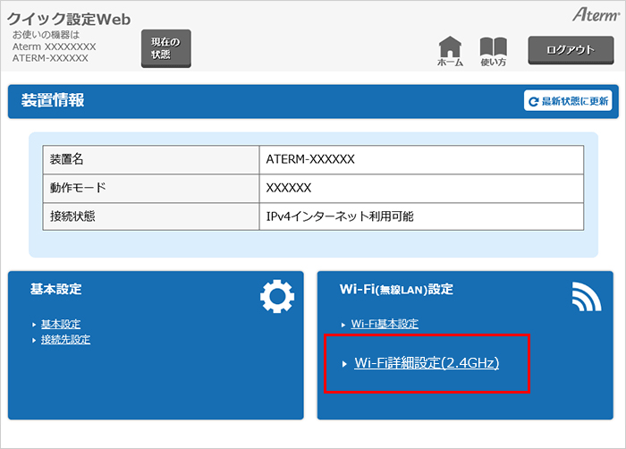 『Wi-Fi(無線LAN)設定』-『Wi-Fi詳細設定(2.4GHz)』を選択してください。
