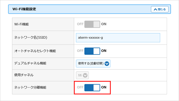 【Wi-Fi機能設定】の[ネットワーク分離機能]を【ON】に切り替えてください。