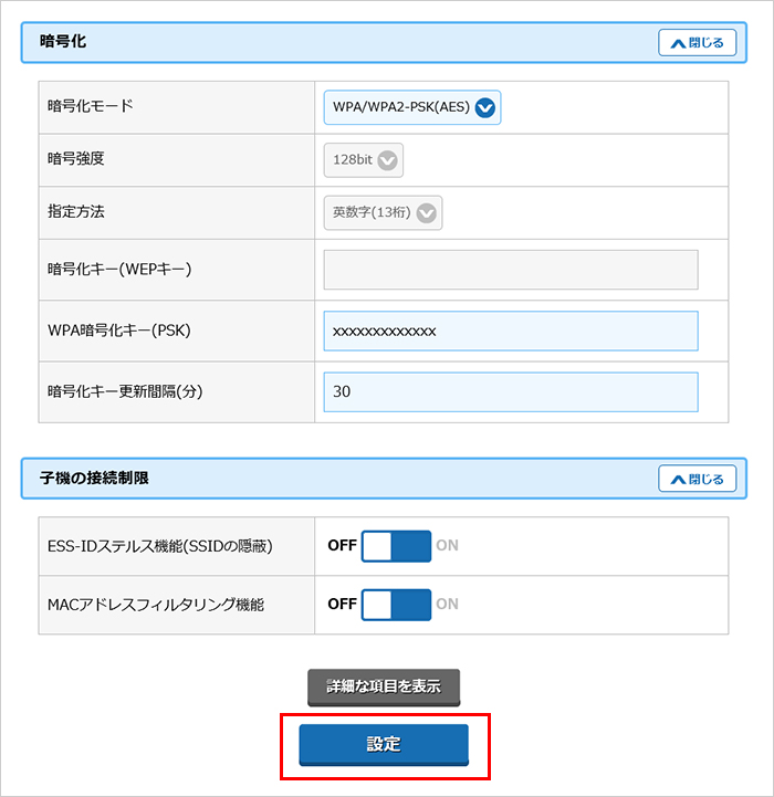 なお、セカンダリSSIDは初期値でネットワーク分離機能・SSID内分離(セパレータ)機能が有効です。