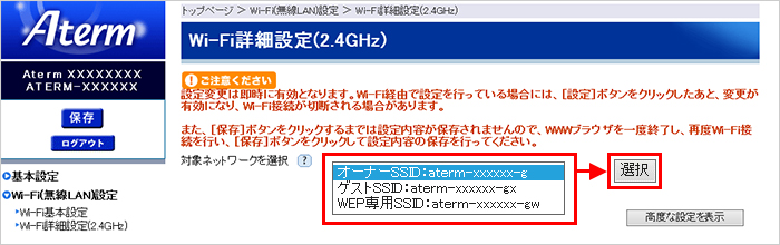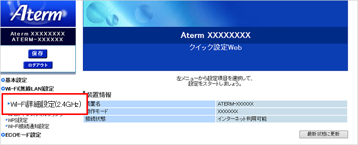 左メニューから『Wi-Fi(無線LAN)設定』-『Wi-Fi詳細設定(2.4GHz)』を選択してください。