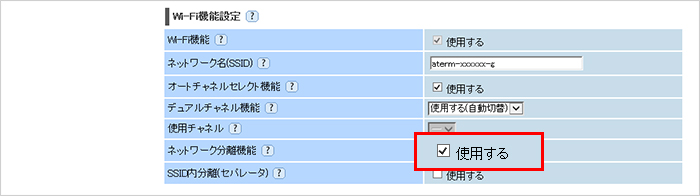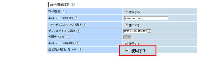 【Wi-Fi機能設定】の[ネットワーク分離機能]で【使用する】のチェックを入れてください。
