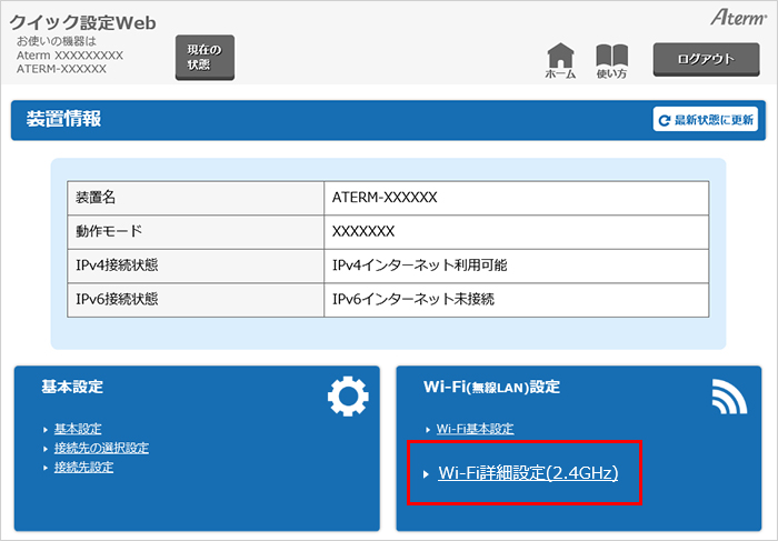 『Wi-Fi(無線LAN)設定』-『Wi-Fi詳細設定(2.4GHz)』を選択してください。