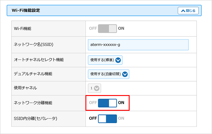 【Wi-Fi機能設定】の[ネットワーク分離機能]を【ON】に切り替えてください。