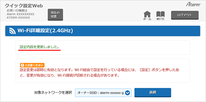 タイトル(『Wi-Fi詳細設定』)の下に、「設定内容を更新しました。」と表示されます。