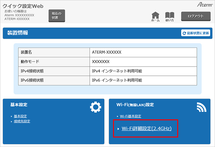 『Wi-Fi(無線LAN)設定』-『Wi-Fi詳細設定(2.4GHz)』を選択してください。