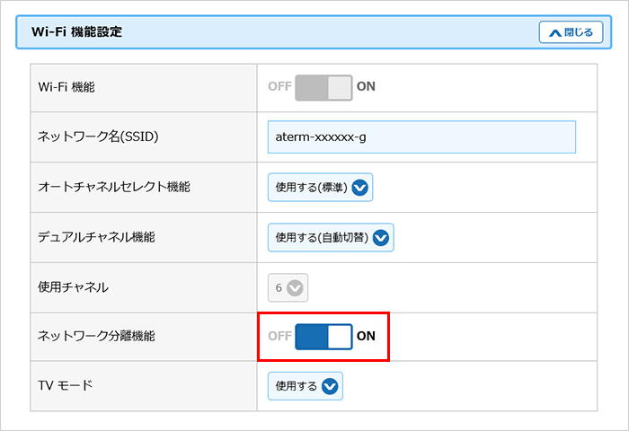 【Wi-Fi機能設定】の[ネットワーク分離機能]を【ON】に切り替えてください。