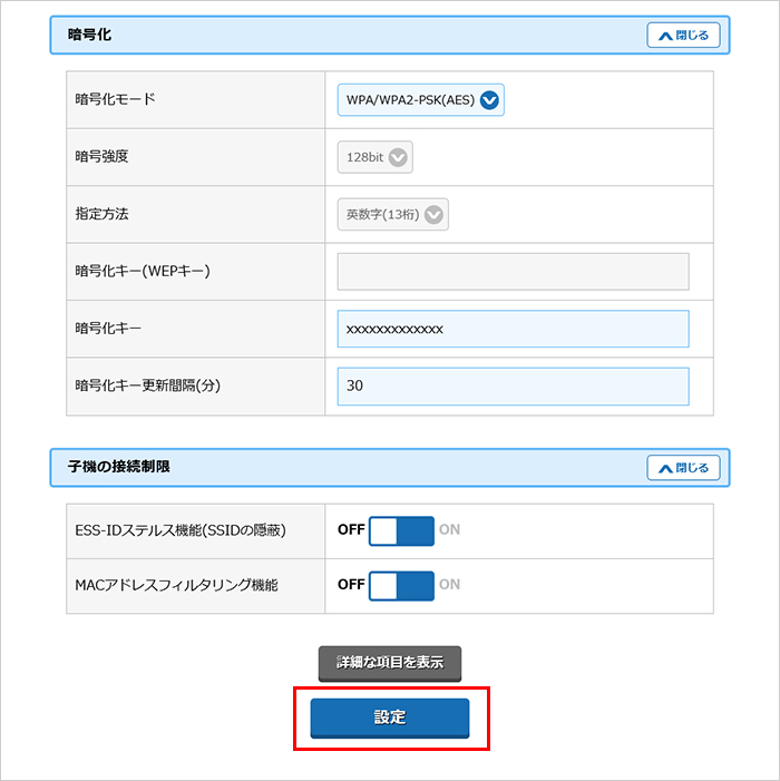 なお、セカンダリSSIDは初期値でネットワーク分離機能・SSID内分離(セパレータ)機能が有効です。