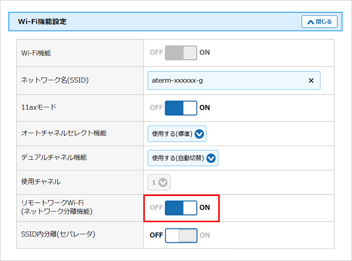 【Wi-Fi機能設定】の[リモートワークWi-Fi(ネットワーク分離機能)]を【ON】に切り替えてください。