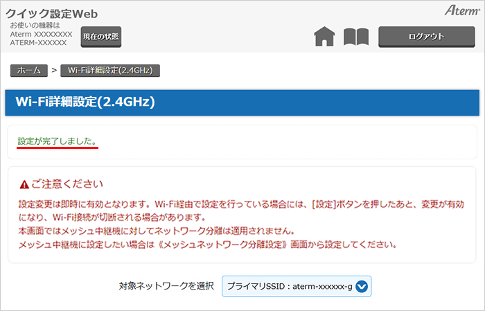 数秒ほど「設定中です。しばらくお待ち下さい。」と表示されたあとに、タイトル(『Wi-Fi詳細設定』)の下に「設定が完了しました。」と表示されます。