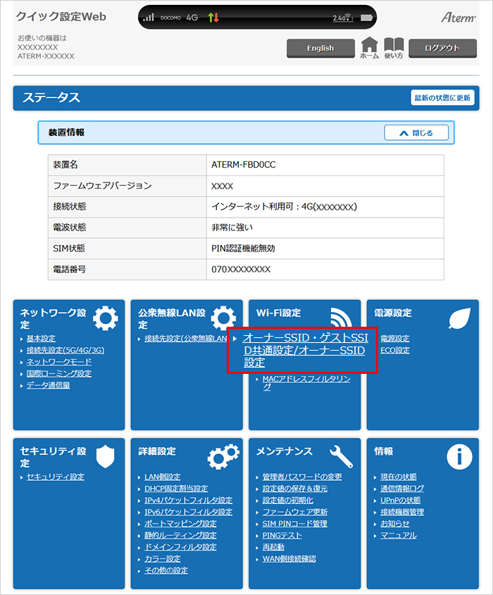 『Wi-Fi設定』-『オーナーSSID・ゲストSSID共通設定/オーナーSSID設定』を選択してください。