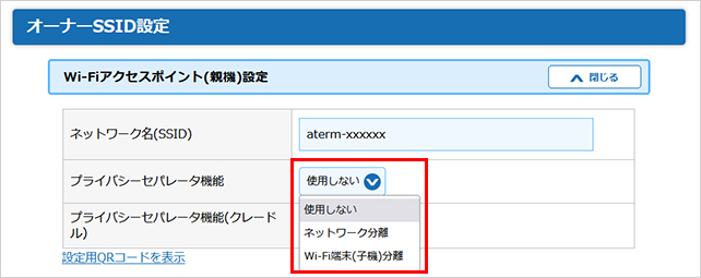 『オーナーSSID設定』-【Wi-Fiアクセスポイント(親機)設定 】の[プライバシーセパレータ機能]で【ネットワーク分離】または【Wi-Fi端末(子機)分離】を選択してください。