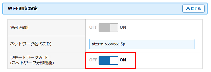 【Wi-Fi機能設定】の[リモートワークWi-Fi(ネットワーク分離機能)]を【ON】に切り替えてください。