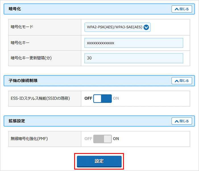 なお、「メッシュWi-Fi機能」と「バンドステアリング機能」を無効にした場合(*)は、『Wi-Fi詳細設定(2.4GHz)』『Wi-Fi詳細設定(5GHz)』『Wi-Fi詳細設定(6GHz)』から、必要に応じて設定を行います。
