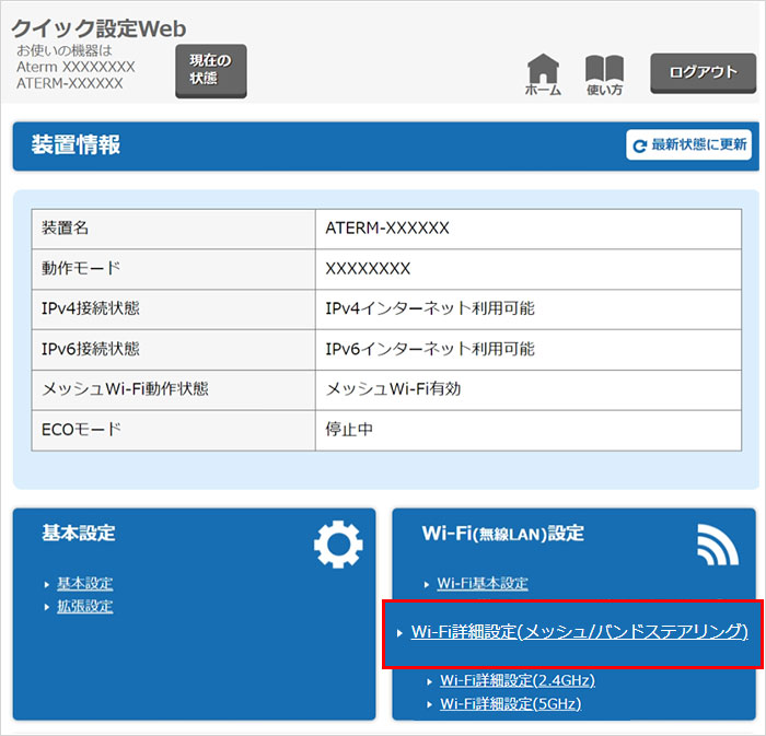 『Wi-Fi(無線LAN)設定』-『Wi-Fi詳細設定(メッシュ/バンドステアリング)』を選択してください。