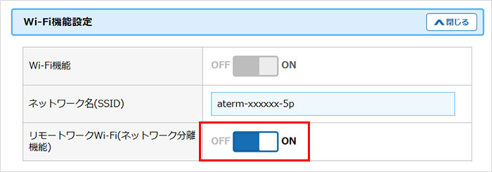 【Wi-Fi機能設定】の[リモートワークWi-Fi(ネットワーク分離機能)]を【ON】に切り替えてください。