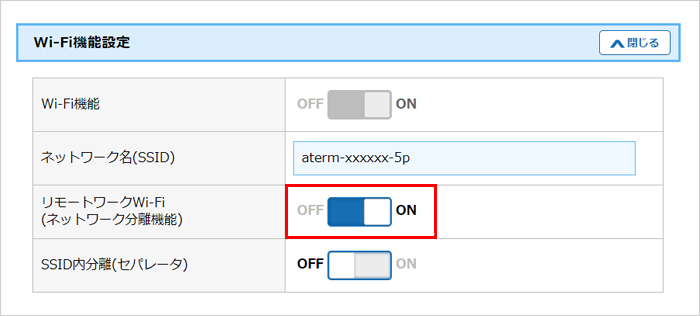 【Wi-Fi機能設定】の[リモートワークWi-Fi(ネットワーク分離機能)]を【ON】に切り替えてください。