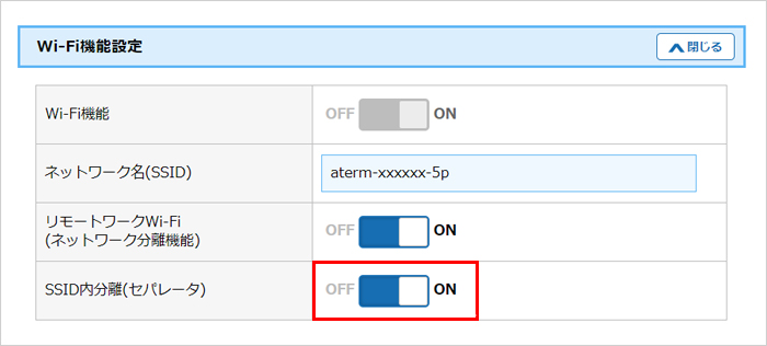 SSID内分離(セパレータ)機能を使用する場合は、[SSID内分離(セパレータ)]で【ON】に切り替えてください。