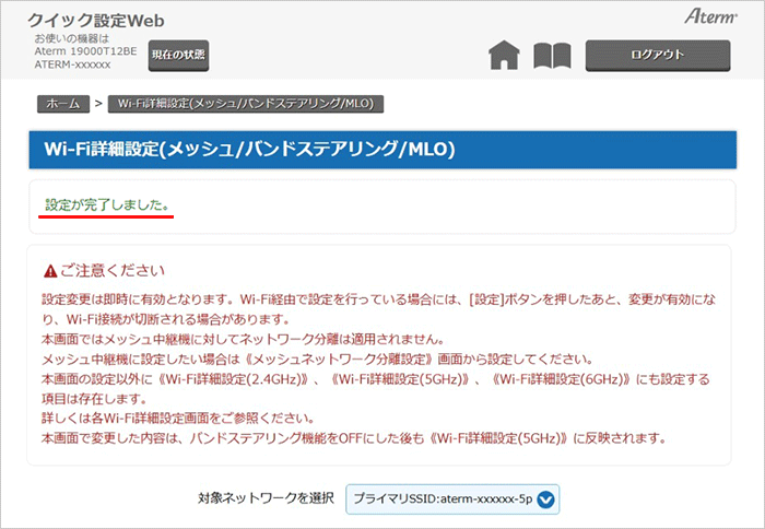 数秒ほど「設定中です。しばらくお待ち下さい。」と表示されたあとに、タイトル(『Wi-Fi詳細設定』)の下に「設定が完了しました。」と表示されます。