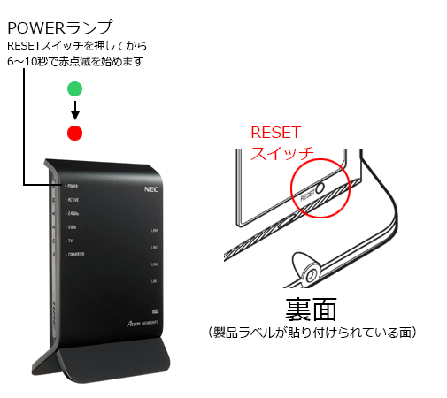 Aterm本体の裏面にあるRESETスイッチを、つまようじの先で押し続け(*1)、POWERランプが赤点滅を始めたら放してください。