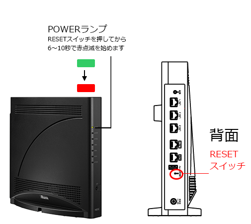 Aterm本体の背面にあるRESETスイッチを、つまようじの先で押し続け(*1)、POWERランプが赤点滅を始めたら放してください。