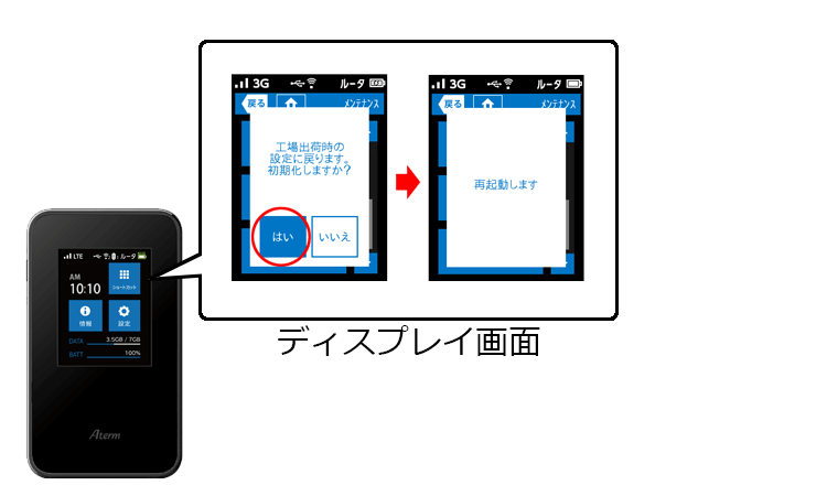 「工場出荷時の設定に戻ります。初期化しますか?」と表示されますので、「はい」をタップしてください。