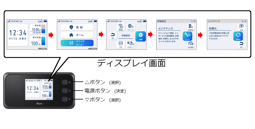 選択はAterm本体の△▽ボタン、決定はAterm本体の電源(決定)ボタンで行ってください。