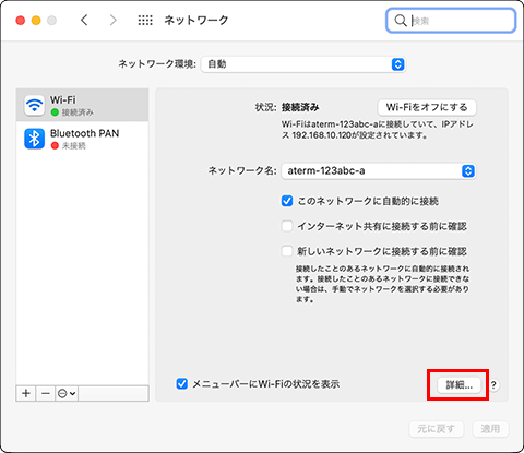 無線LAN端末に割り当てられているIPアドレスなどの情報が確認できます。