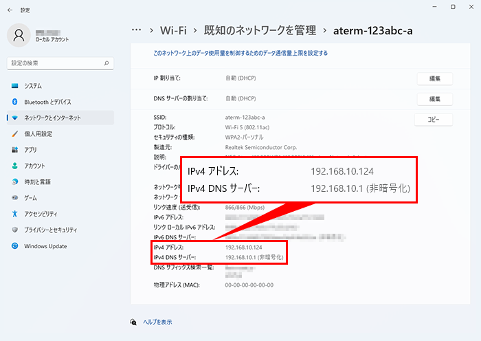 IPv6でインターネットに接続できている場合は、『IPv6 アドレス』『リンク ローカル IPv6 アドレス』『IPv6 DNSサーバー』なども確認できます。