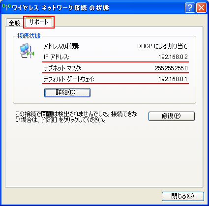 「サポート」タグを押すと、接続状態で『IPアドレス』『サブネットマスク』『デフォルトゲートウェイ』の値が確認できます。