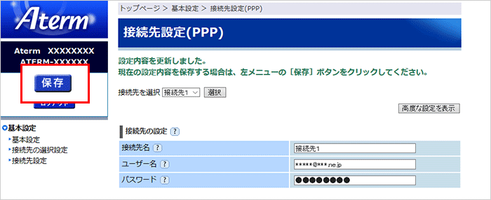 クイック設定Webのメニューから、【保存】ボタンを押してください。