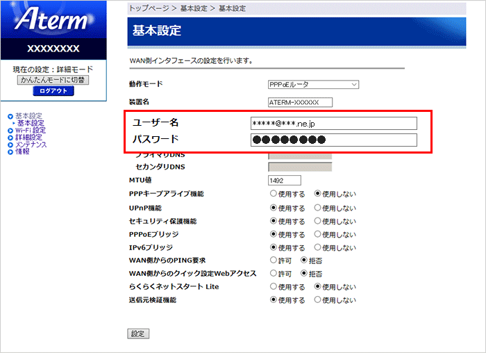 「ユーザー名」「パスワード」… 回線事業者(NTT・ケーブルTV局など)または接続事業者(プロバイダ)より提供された資料に記載の「ID(ユーザ名・ユーザ ID・認証ID など)」「パスワード」を入力してください。