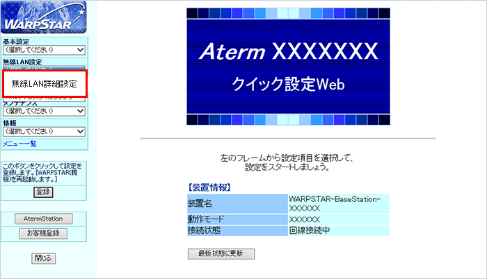 クイック設定Webのメニューから、『無線LAN設定』-『無線LAN詳細設定』を選択してください。
