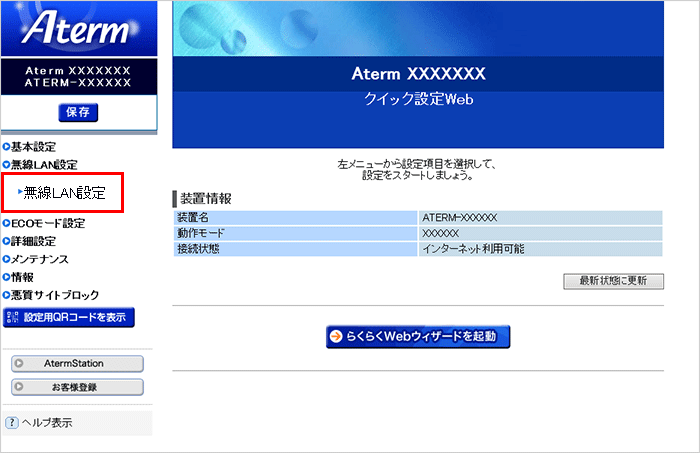 クイック設定Webのメニューから、『無線LAN設定』-『無線LAN設定』を選択してください。