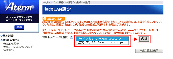 選択肢に「プライマリSSID」「セカンダリSSID」の表記がない場合は、選択肢上側が「プライマリSSID」、選択肢下側が「セカンダリSSID」です。