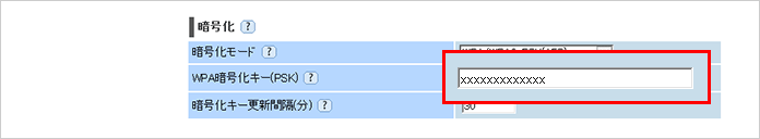 『暗号化』の「WPA暗号化キー(PSK)」から、変更後の暗号化キーの確認が行えます。