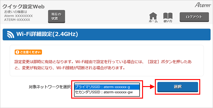 本手順では、『Wi-Fi詳細設定(2.4GHz)』を選択した場合を例に進めます。