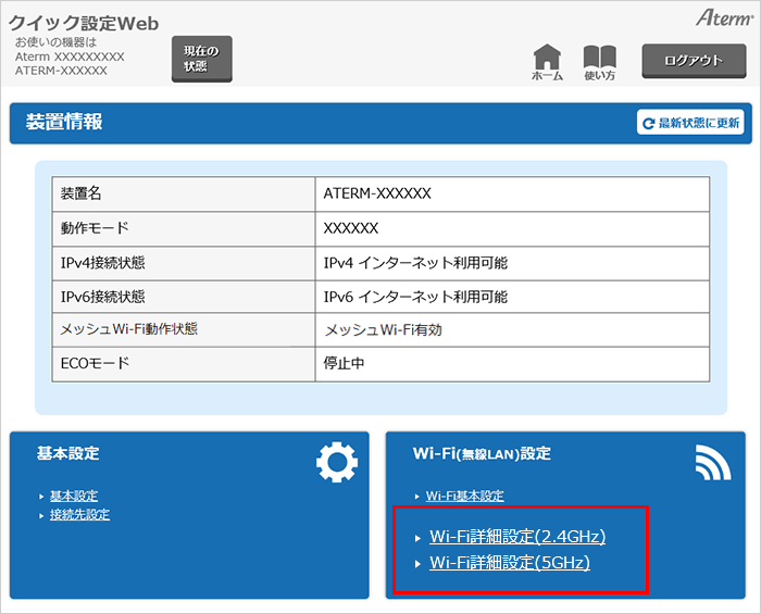 クイック設定Webのメニューから、『Wi-Fi詳細設定(2.4GHz)』または『Wi-Fi詳細設定(5GHz)』を選択してください。