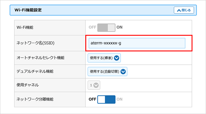 『Wi-Fi機能設定』の「ネットワーク名(SSID)」から、変更後のネットワーク名(SSID)の確認が行えます。