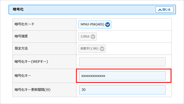 『暗号化』の「暗号化キー」から、変更後の暗号化キーの確認が行えます。