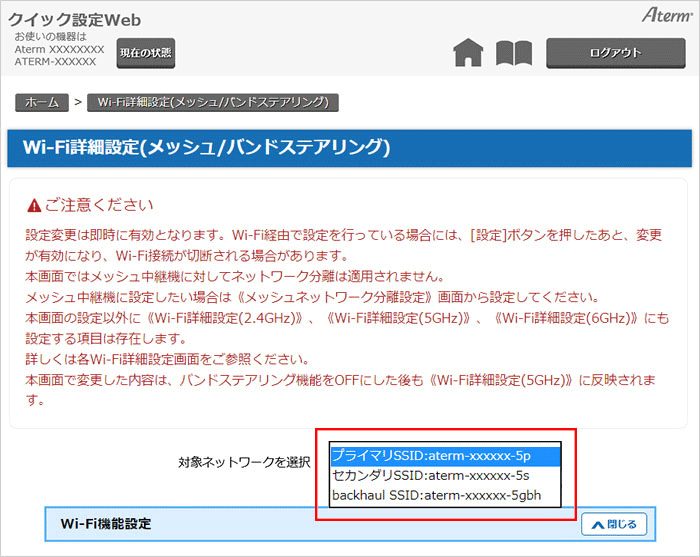 2.4GHz / 5GHz / 6GHz帯が共通の設定内容のため、『Wi-Fi詳細設定(メッシュ/バンドステアリング)』で確認を行います。