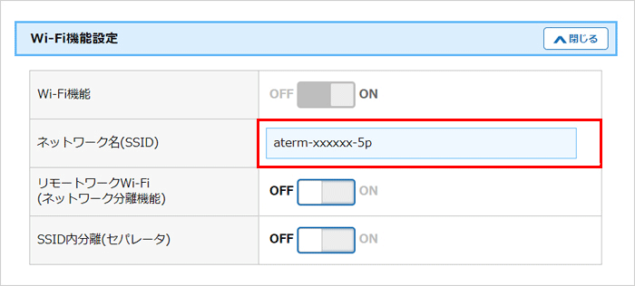 『Wi-Fi機能設定』の「ネットワーク名(SSID)」から、変更後のネットワーク名(SSID)の確認が行えます。
