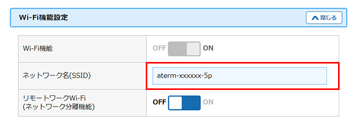 『Wi-Fi機能設定』の「ネットワーク名(SSID)」から、変更後のネットワーク名(SSID)の確認が行えます。