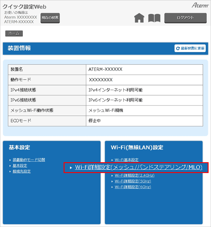 確認手順については、『Wi-Fi詳細設定(メッシュ/バンドステアリング/MLO)』で行う場合と同様です。