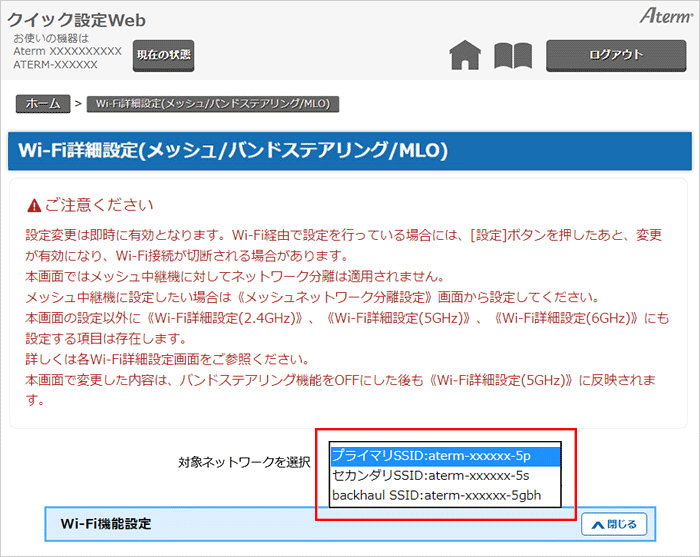2.4GHz / 5GHz / 6GHz帯が共通の設定内容のため、『Wi-Fi詳細設定(メッシュ/バンドステアリング/MLO)』で確認を行います。