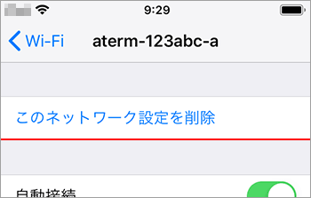 iPhone / iPad / iPod touchに保存したAtermのWi-Fi(無線)設定の削除手順は、以下のとおりです。