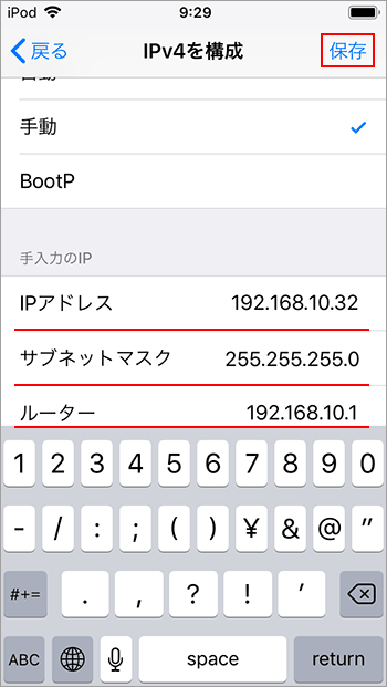 iPhone / iPad / iPod touchに保存したWi-Fi(無線)設定のIP構成を自動から手動に変更する手順は、以下のとおりです。