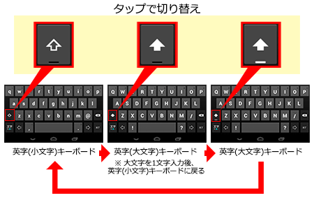 「↑」キーを1回タップした場合は、1文字のみ大文字で入力できるようになります。