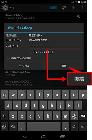 手順冒頭の事前準備で確認したAterm親機の暗号化キーを入力して、【接続】をタップしてください。