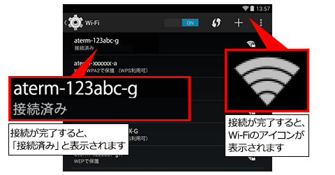 Atermのネットワーク名(SSID)の下側に、「接続済み」と表示されます。