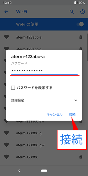手順冒頭の事前準備で確認したAterm親機の暗号化キーを入力して、【接続】をタップしてください。